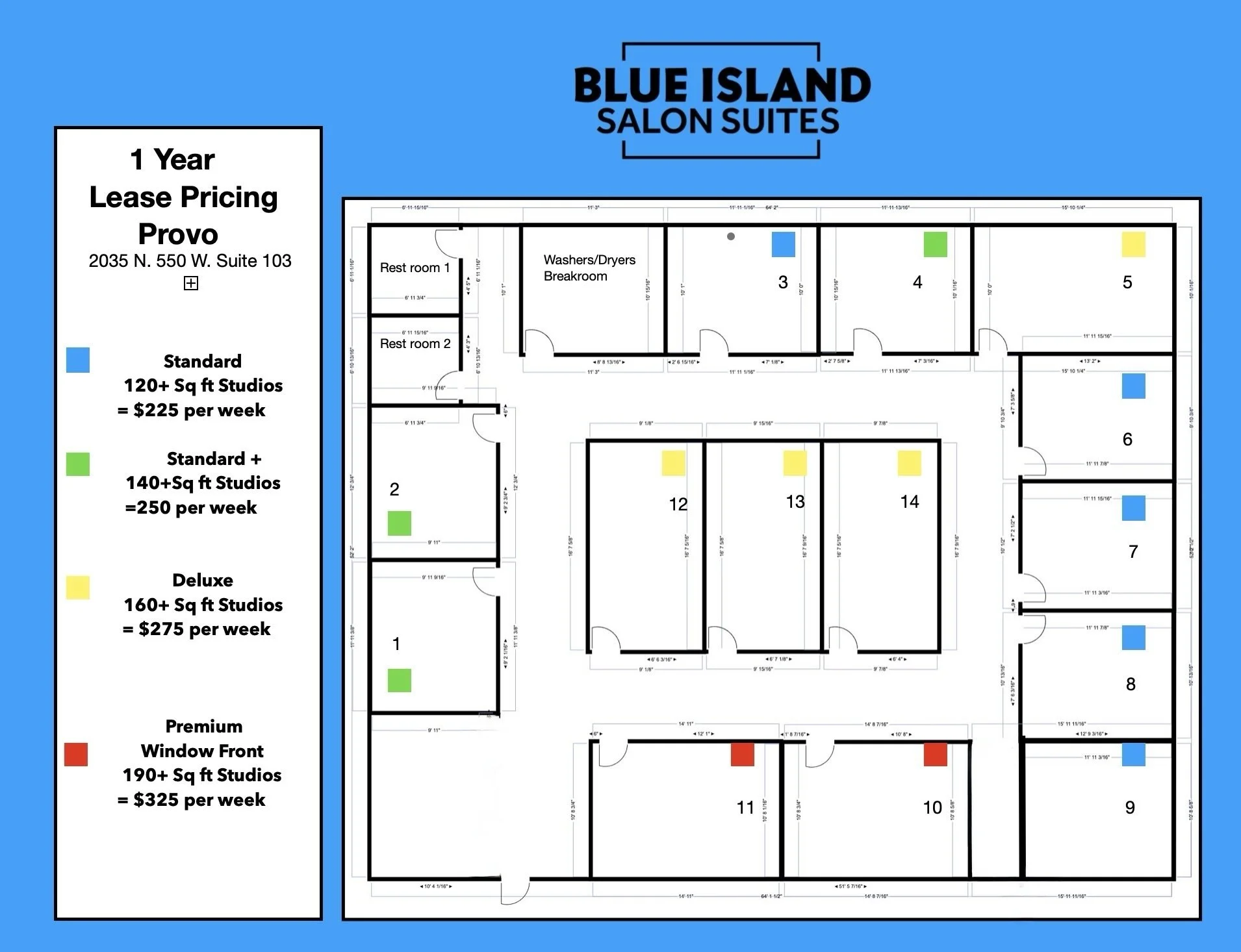 Weekly rent with Blue Island Salon Suites includes all utilities, wifi, laundry room access, and complimentary tickets to two National Guest Artist education classes per year. (Business/Artistic).